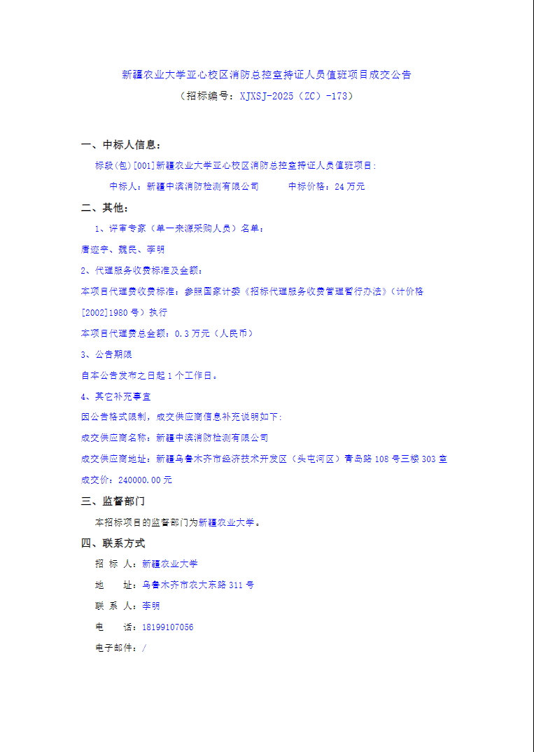 新疆农业大学亚心校区消防总控室持证人员值班项目成交公告