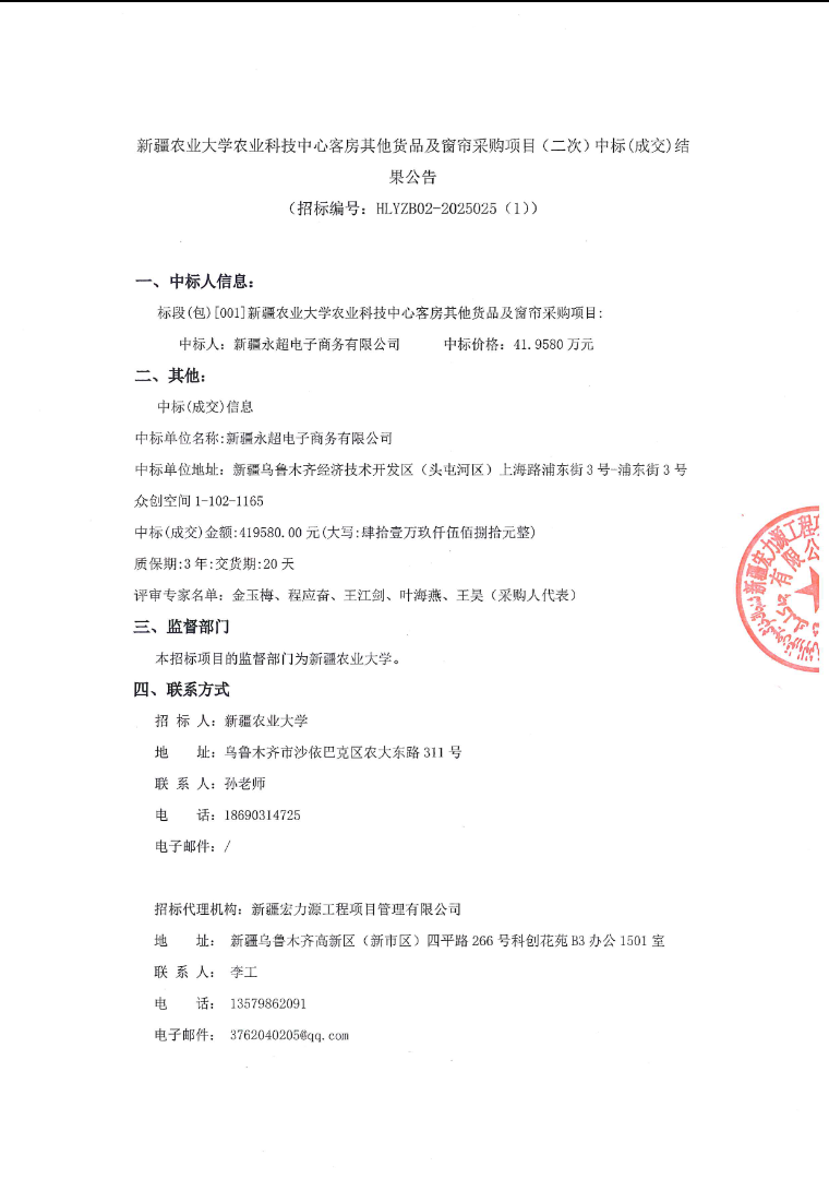 新疆农业大学农业科技楼客房其他用品及窗帘采购项目(二次)中标结果公告