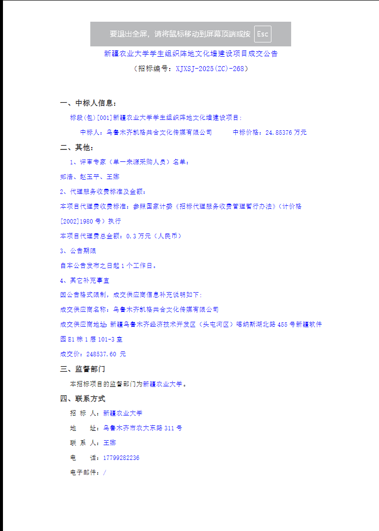 新疆农业大学学生组织阵地文化墙建设项目成交公告