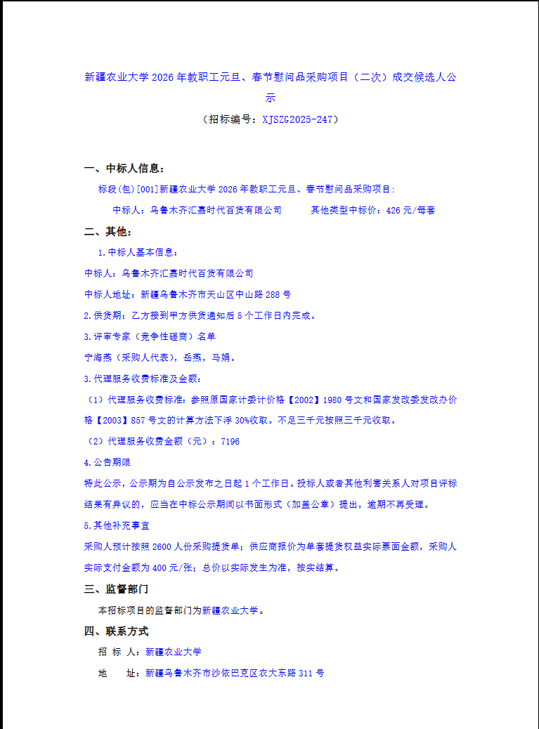 新疆农业大学2026年教职工元旦、春节慰问品项目成交候选人公示