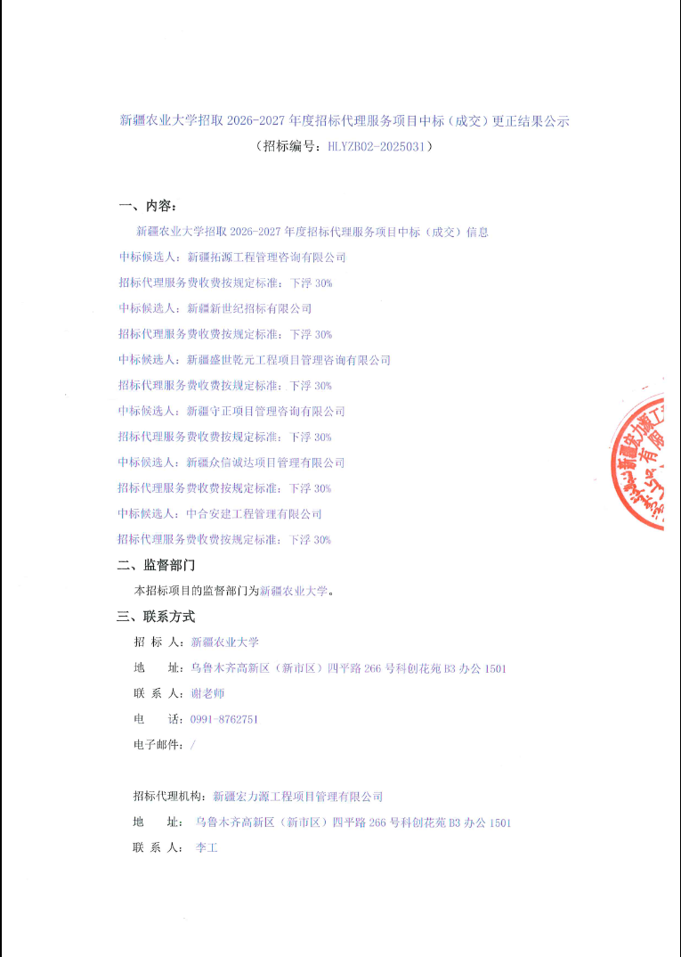 新疆农业大学招取2026-2027年度招标代理服务项目中标(成交)更正结果公示