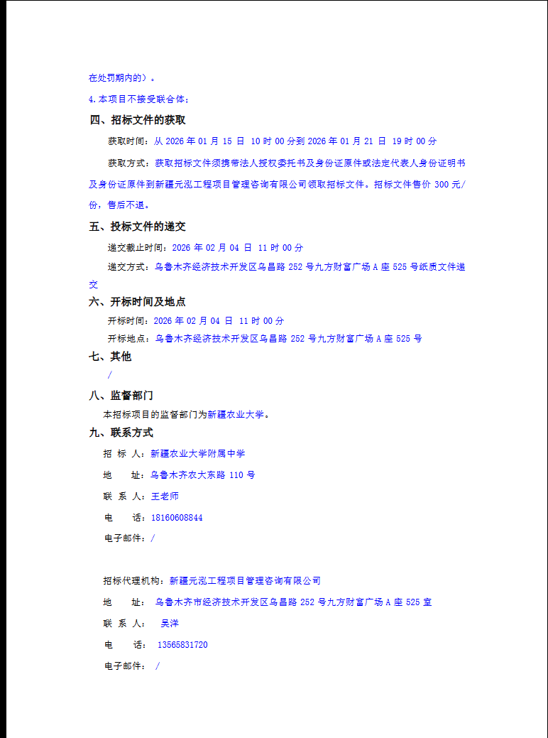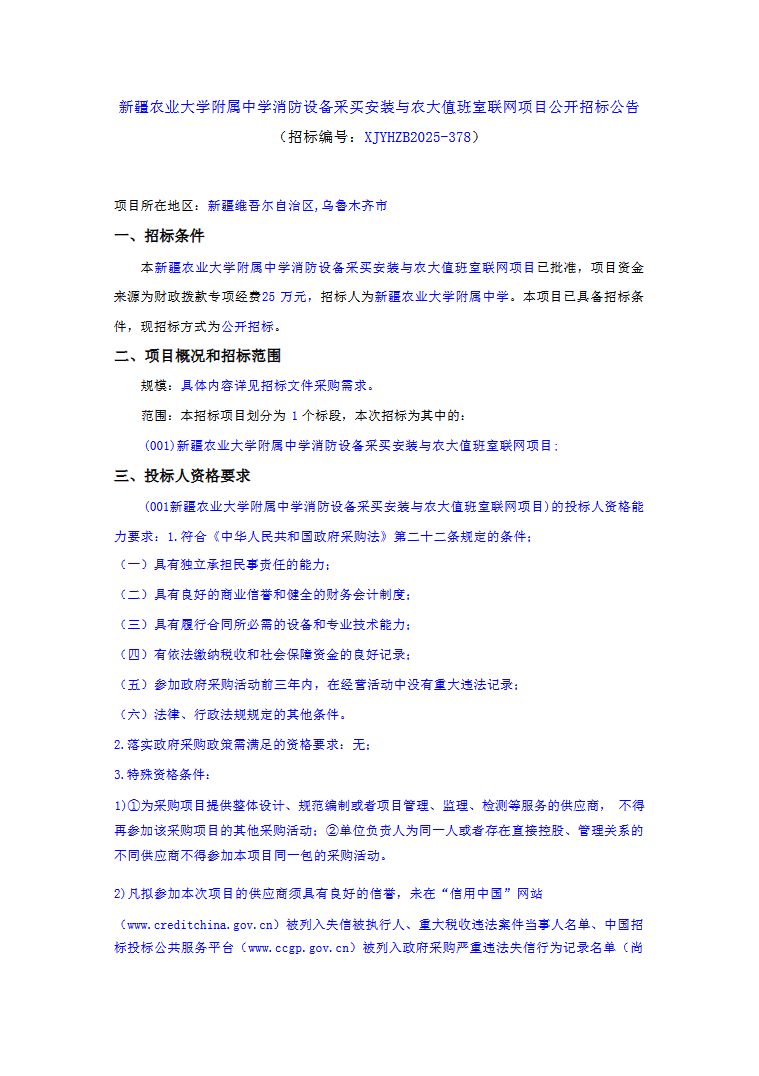 新疆农业大学附中消防设备采买安装与农大值班室联网项目公开招标公告