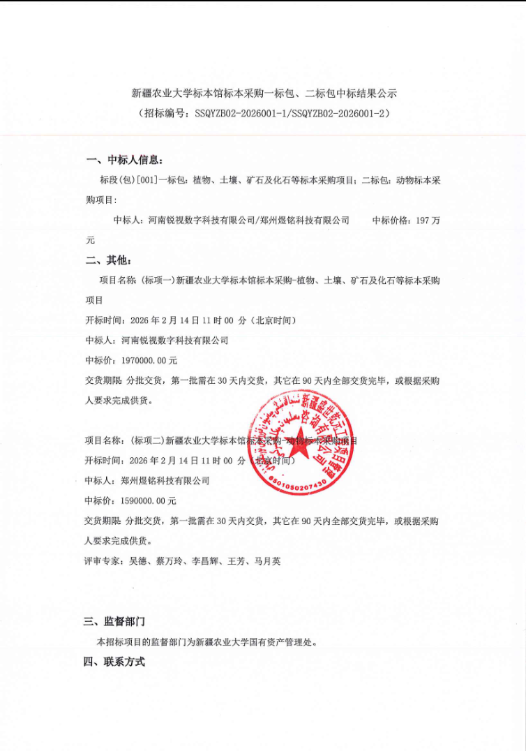 新疆农业大学标本馆标本采购一标包、二标包中标结果公示