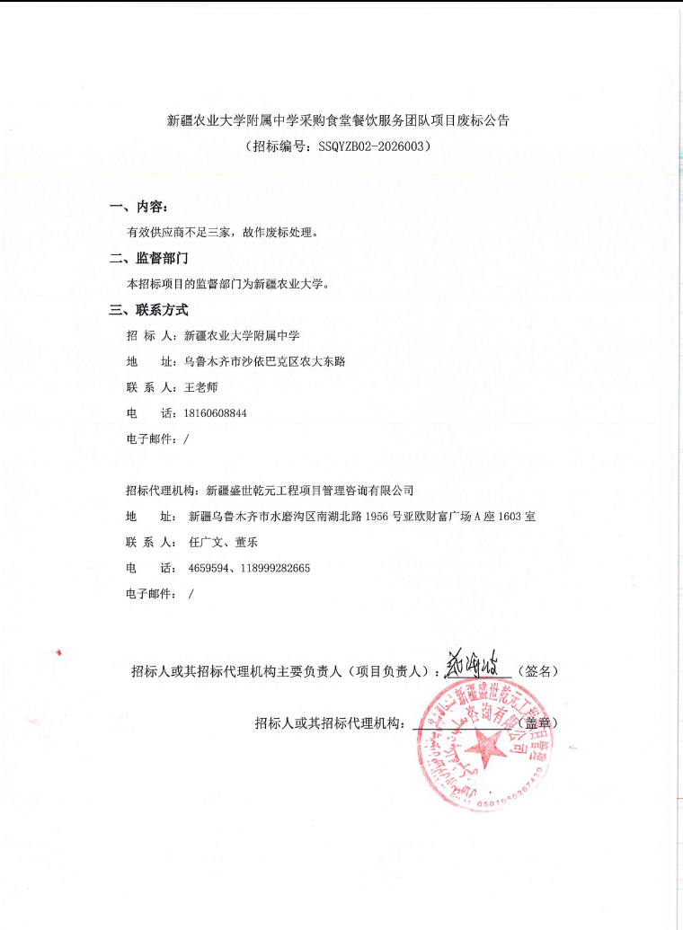 新疆农业大学附属中学采购食堂餐饮服务团队项目废标公告