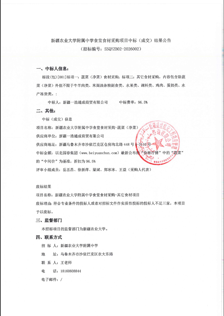 新疆农业大学附属中学食堂食材采购项目中标结果公告