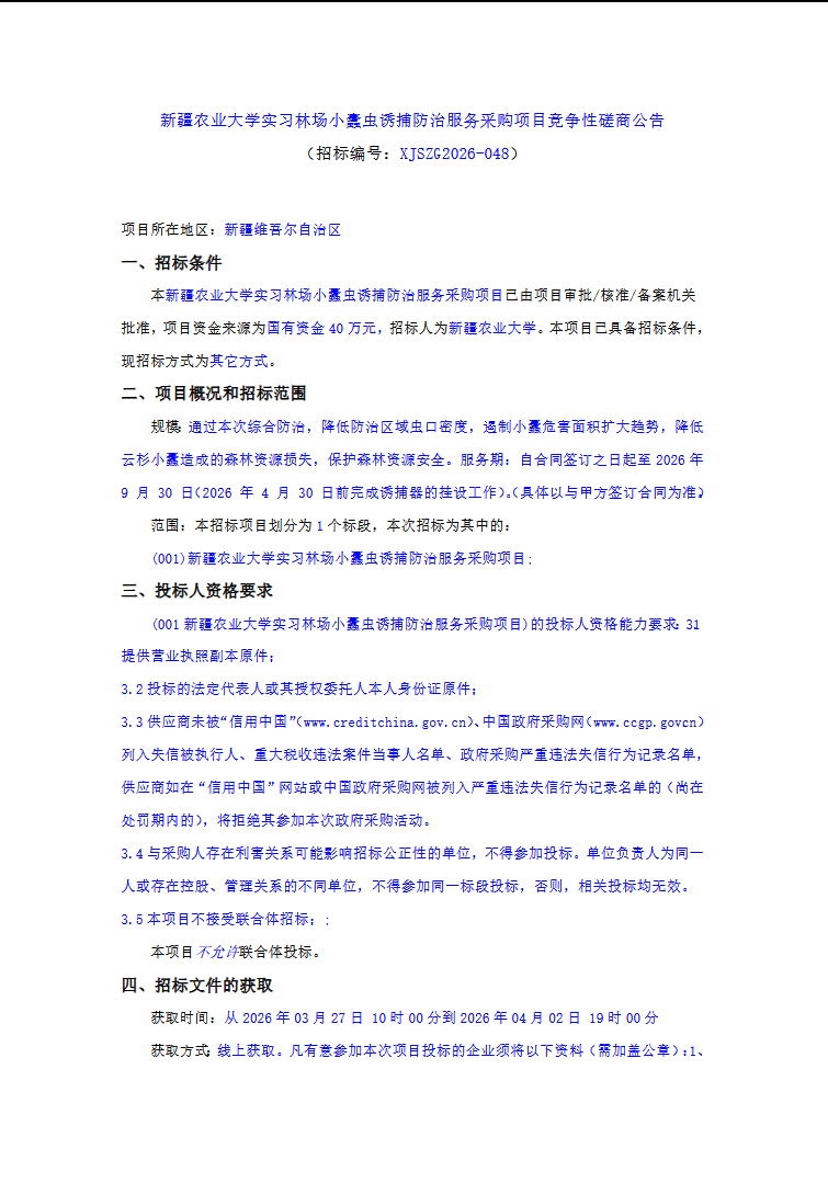 新疆农业大学实习林场小蠹虫诱捕防治服务采购项目竞争性磋商公告